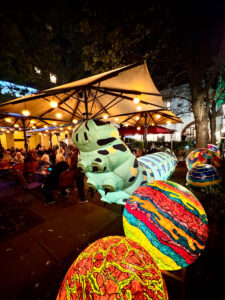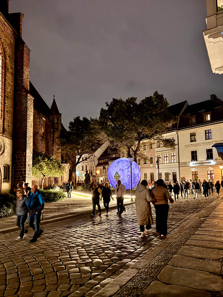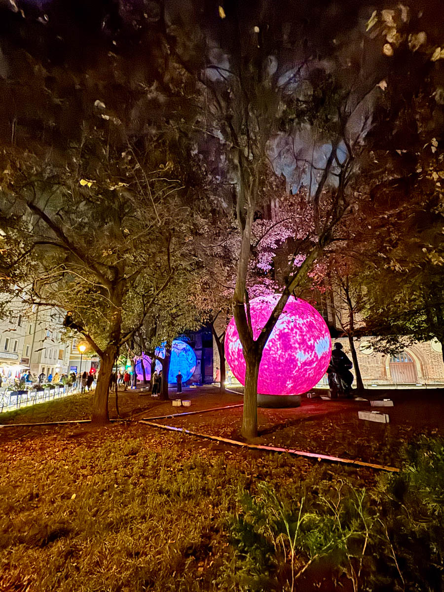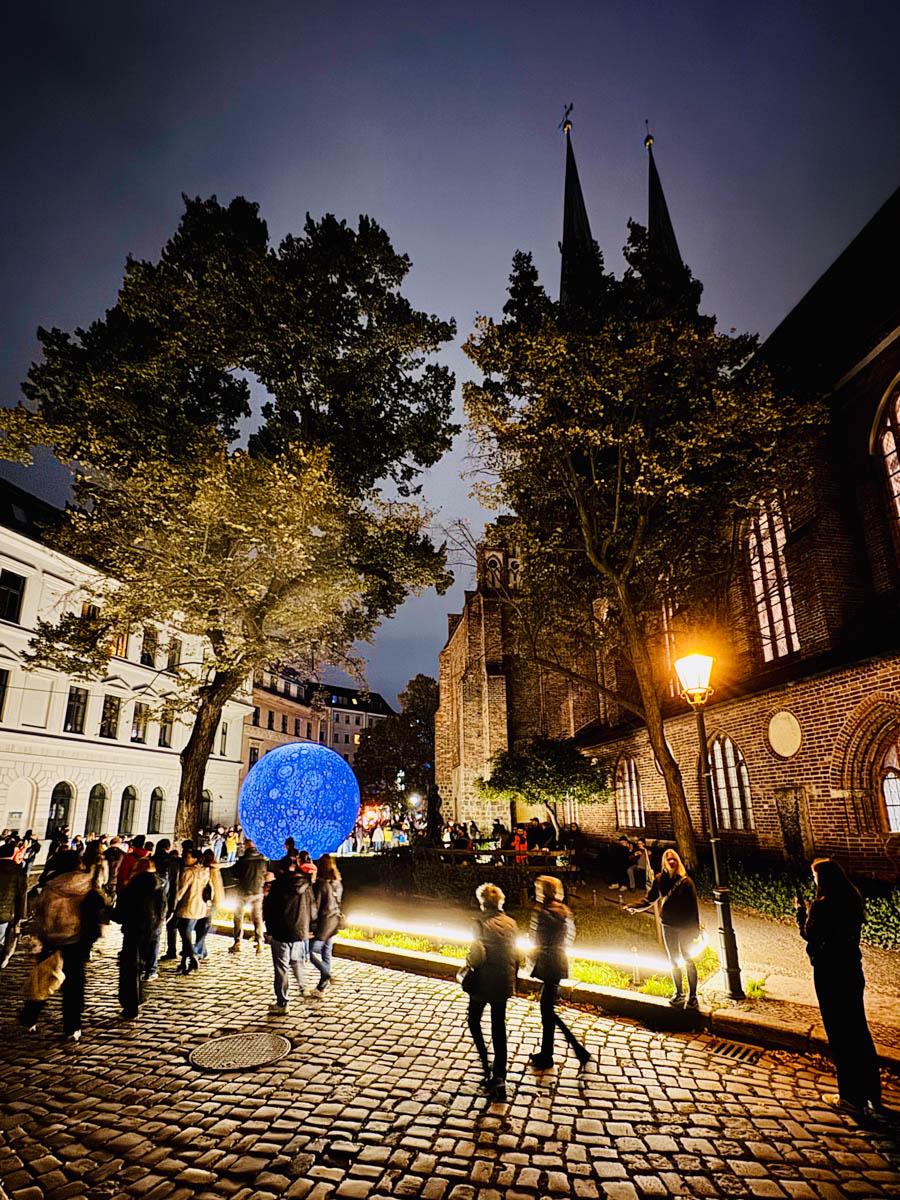 At the corner of Spandauer Strasse and Rathausstrasse, visitors are greeted by a video installation on the facade of the former Kaufhaus Israel department store. Entitled “Simply Enchanting,” it begins with a magician inviting visitors into the magical world of Harry Potter. To the left, you can enter the Nikolaiviertel via the Straße am Nussbaum, which is colorfully staged. After a few steps, you reach Nikolaikirchplatz, where the installation “Luminary” is presented towards Eiergasse. It consists of the luminous celestial bodies Sun, Earth, Moon, and Mars and is simply a great photo backdrop.