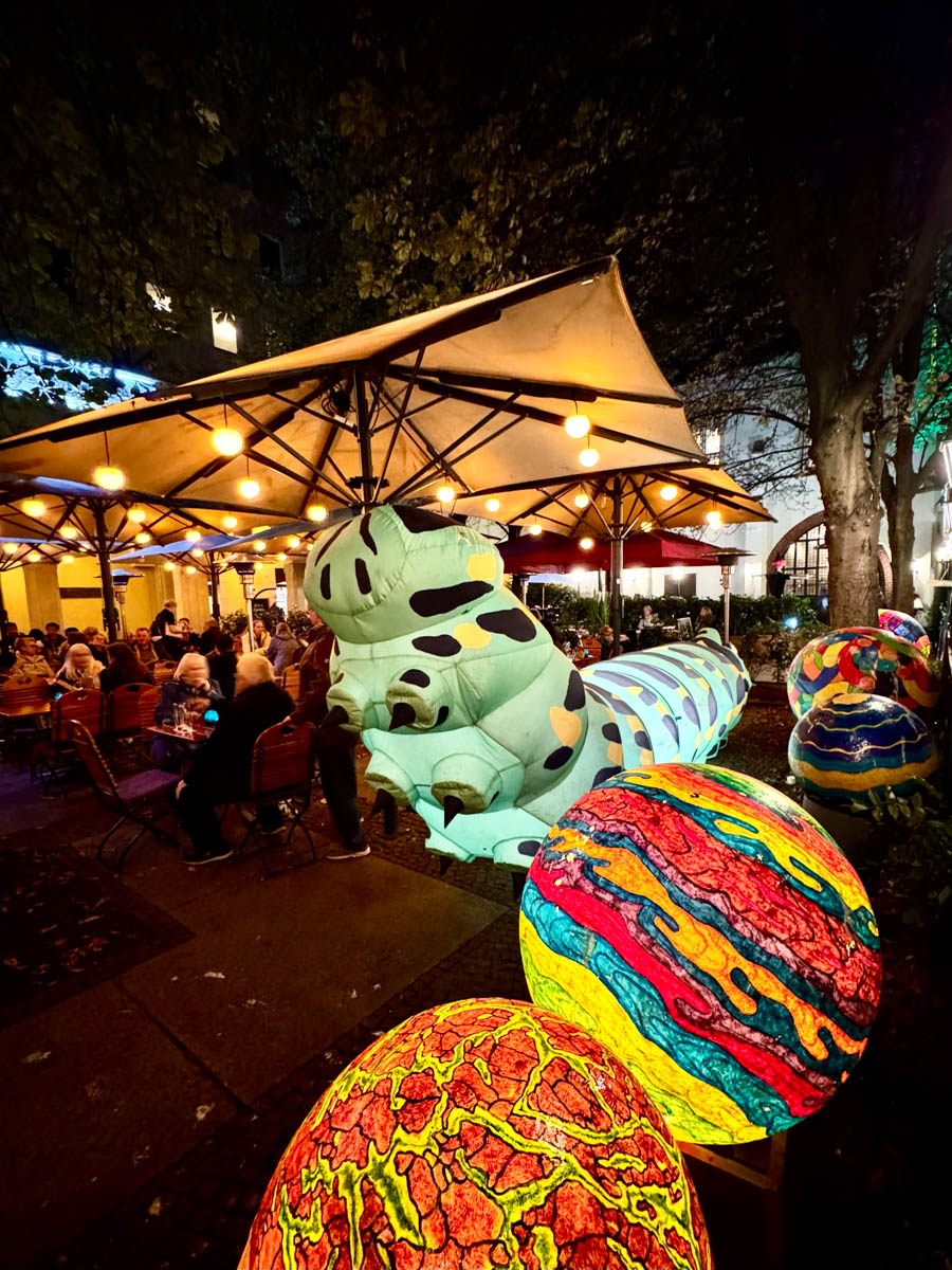 From the church square, Propststraße with its colorfully illuminated arcades leads towards the banks of the Spree and the “St. George” monument. To the northeast, Poststraße leads out of the area again towards Rathausstraße. Here, the façade of the restaurant “Zur Gerichtslaube” is illuminated with colorful projections, and right next door, in the beer garden of the restaurant “Fischer & Lustig,” there is a light installation featuring a giant green caterpillar, which, as last year, is a favorite with most children.