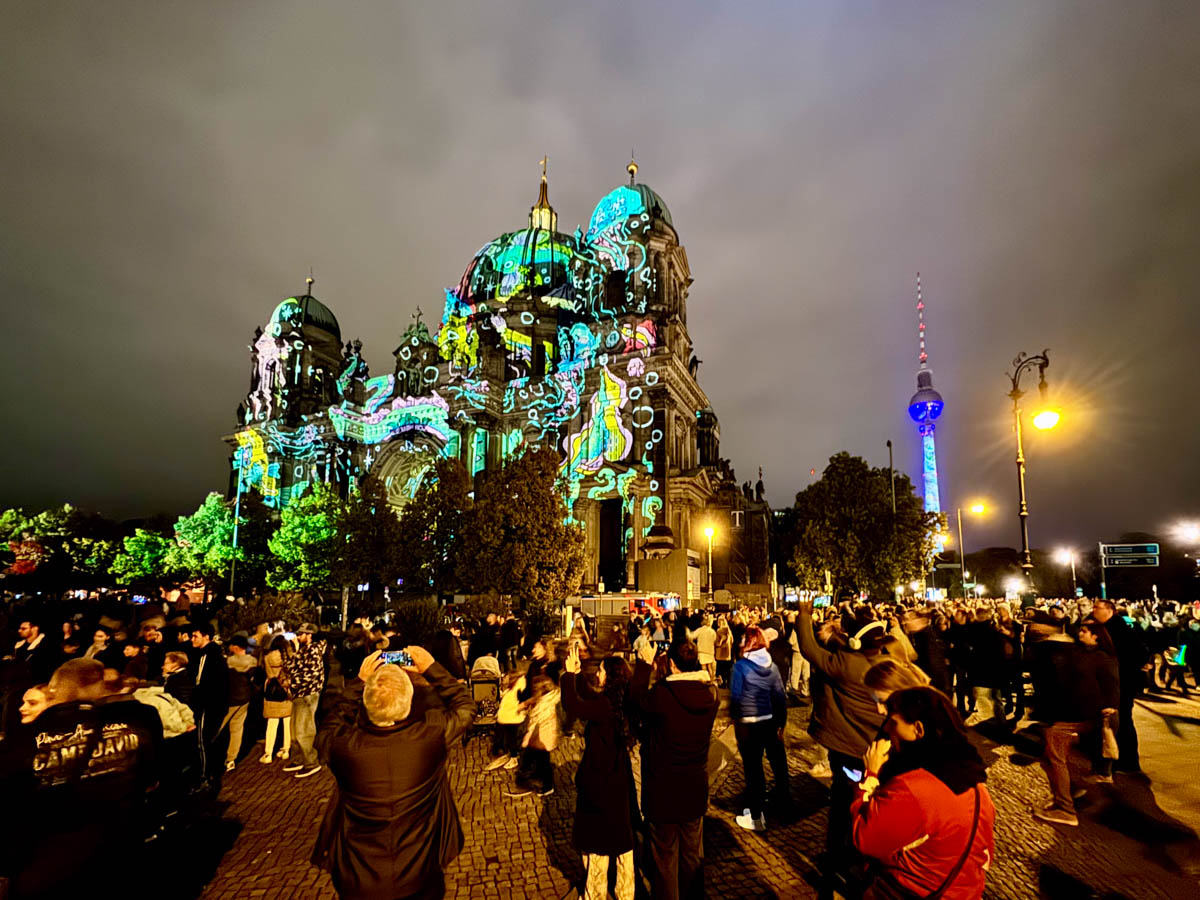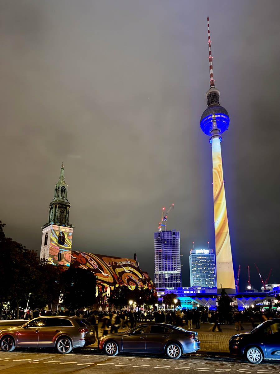 Once you reach Rathausstraße, you can cross the Spree to the left and walk past the Humboldt Forum to Berlin Cathedral, and then discover the other highlights of the Festival of Lights in Berlin Mitte. Either head west along Unter den Linden, which is closed to cars, to the Brandenburg Gate, or of course to Alexanderplatz with its spectacular 3D video mapping show.