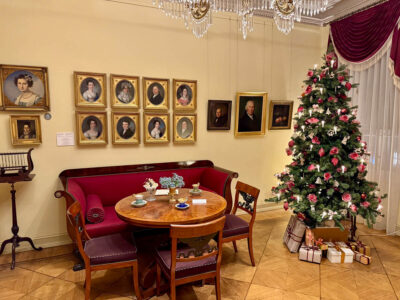 Ein prächtig geschmückter Baum steht natürlich auch im Salon des Hauses. Hier traf sich der Hausherr mit Geschäftspartnern und Freunden und so gingen u.a. auch prominente Berliner Persönlichkeiten dieser Zeit, wie der Architekt Karl Friedrich Schinkel und die Brüder Wilhelm und Alexander von Humboldt hier ein und aus. Mit deren Leben befasst sich übrigens ein eigener Ausstellungsbereich im Obergeschoss, so daß man hier auch Spannendes über den Bildungsreformer Wilhelm und den berühmten Forschungsreisenden Alexander von Humboldt lernen kann.