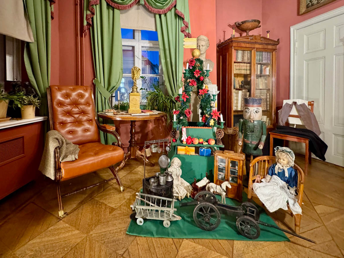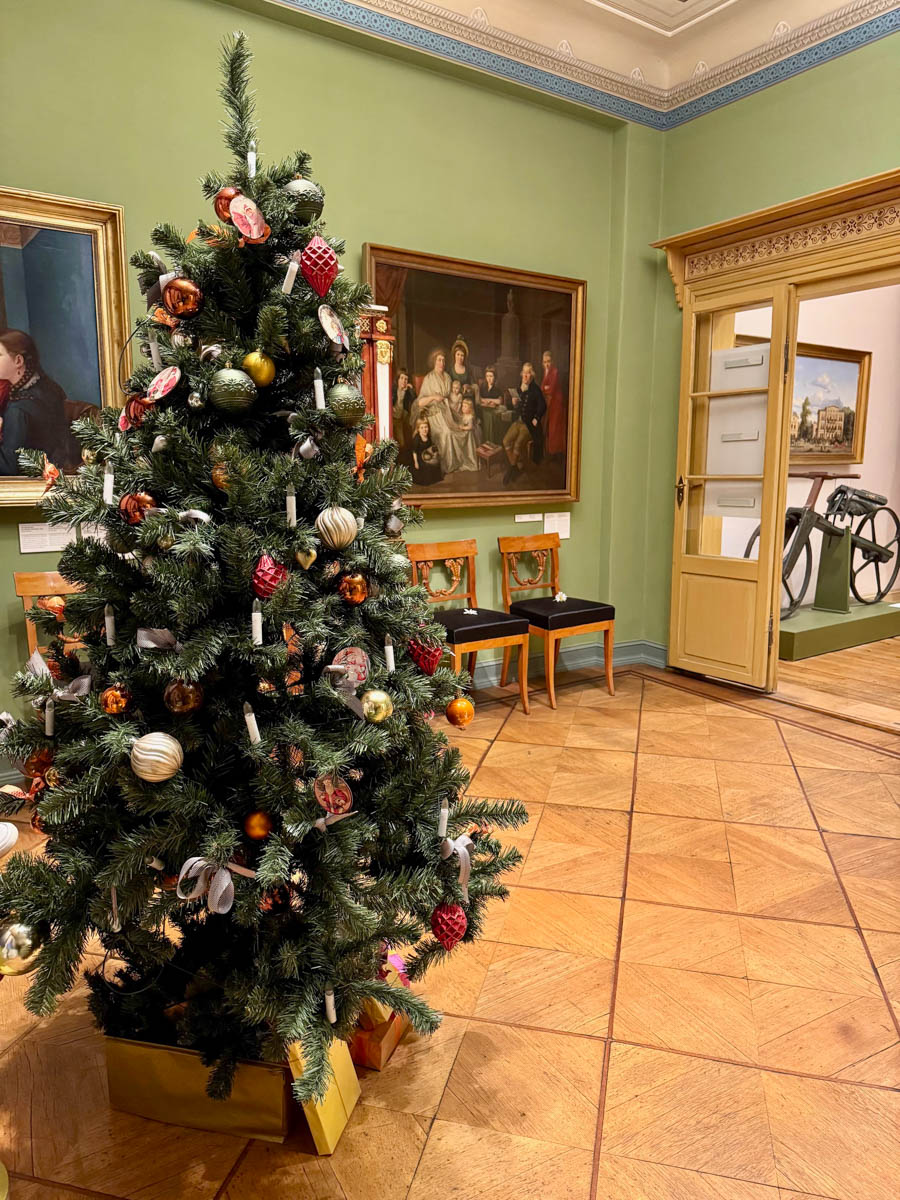 Ein prächtig geschmückter Baum steht natürlich auch im Salon des Hauses. Hier traf sich der Hausherr mit Geschäftspartnern und Freunden und so gingen u.a. auch prominente Berliner Persönlichkeiten dieser Zeit, wie der Architekt Karl Friedrich Schinkel und die Brüder Wilhelm und Alexander von Humboldt hier ein und aus. Mit deren Leben befasst sich übrigens ein eigener Ausstellungsbereich im Obergeschoss, so daß man hier auch Spannendes über den Bildungsreformer Wilhelm und den berühmten Forschungsreisenden Alexander von Humboldt lernen kann.