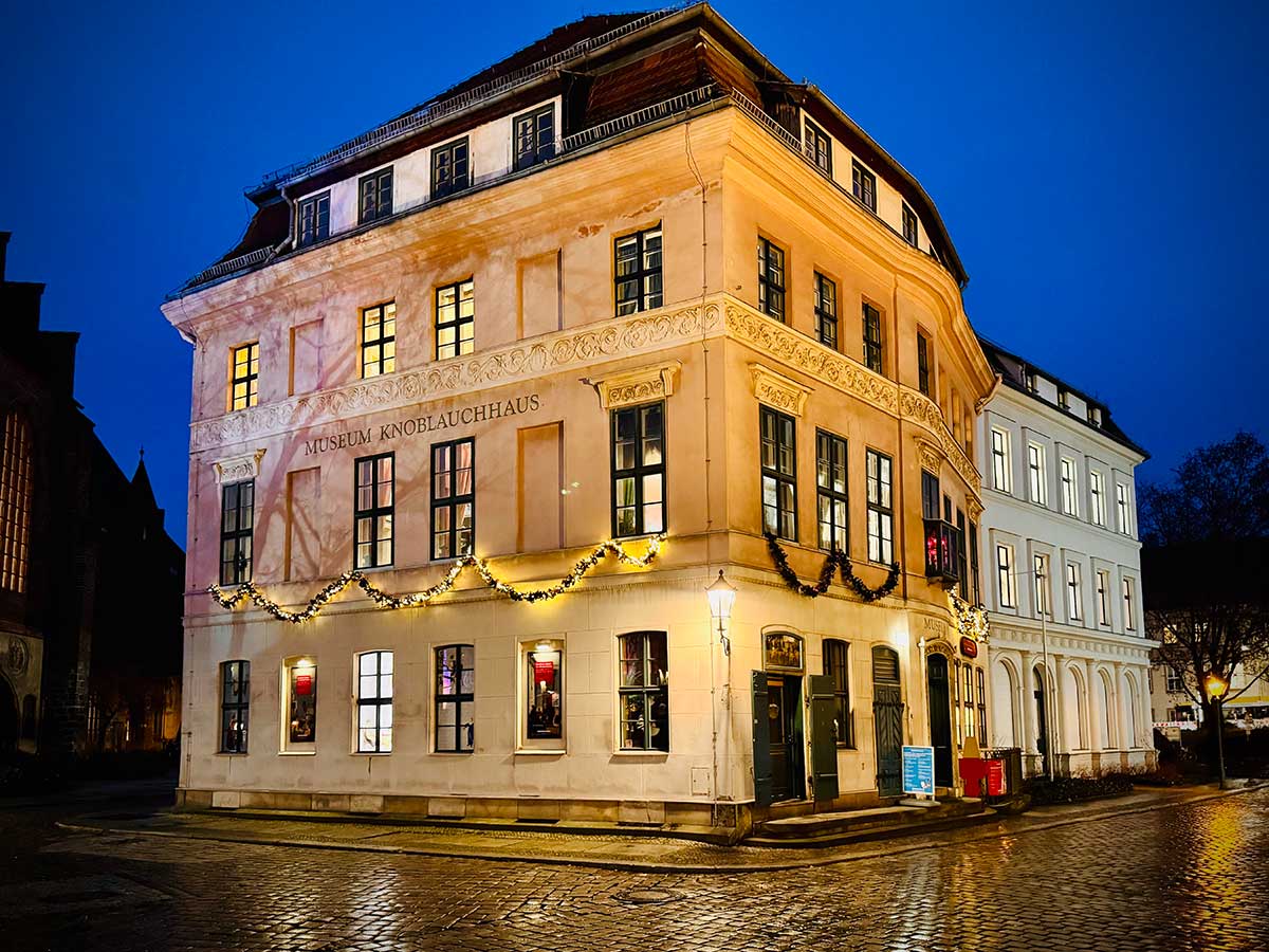 Das Museum Knoblauchhaus strahlt noch bis zum 4. Januar als Weihnachtshaus in festlichem Glanz. Ein Tagesticket kostet 5 €. Das Museum Knoblauchhaus hat Dienstags bis Sonntags von 10 bis 18 Uhr geöffnet. Während der Feiertage abweichende Öffnungszeiten sowie weitere Informationen findet man hier: www.stadtmuseum.de/veranstaltungen/weihnachtshaus